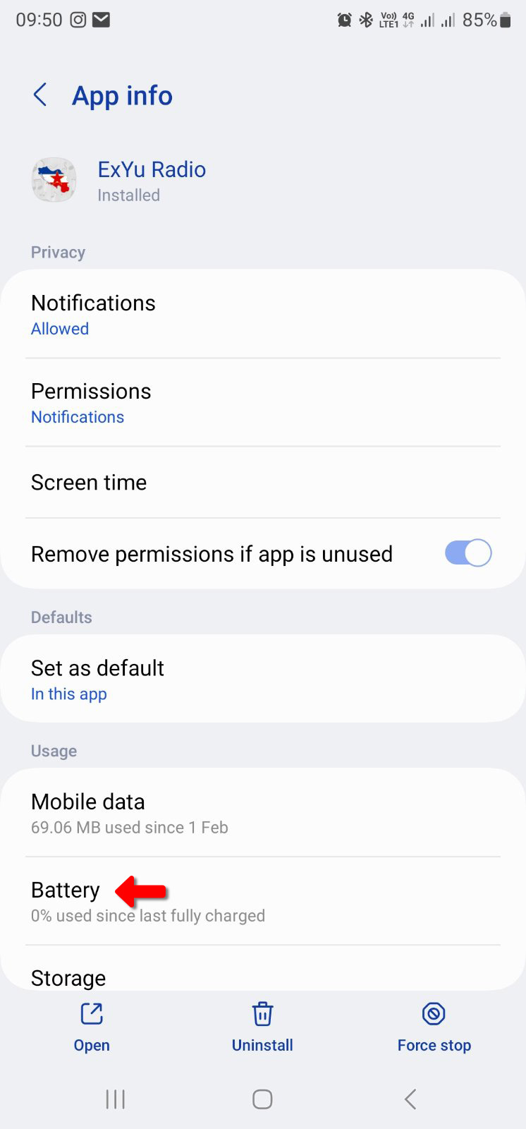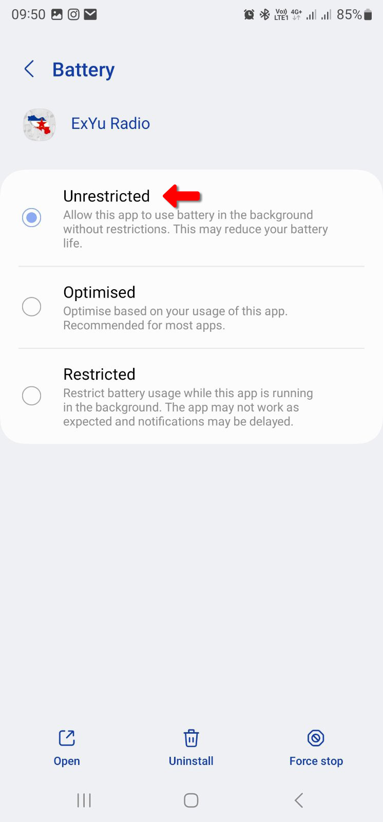 Otvorite opciju PODEŠAVANJE na Vašem telefonu, pronadjite opciju APLIKACIJE, na listi svih aplikacija pronadjite aplikaciju ExYu Radio, kliknite na opciju BATERIJA i odaberite da aplikacija NEMA RESTRIKCIJA po pitanju baterije.